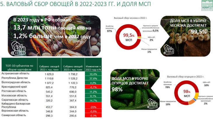 Перейдя к теме овощеводства, спикер особенно подчеркнул роль ЛПХ, высокие результаты ФГБНУ «Федеральный научный центр овощеводства».