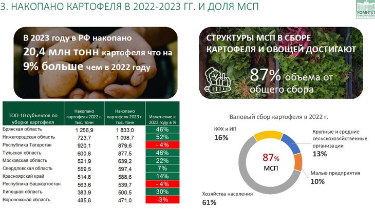 «На слайде выделены 10 лучших регионов по производству картофеля, посмотрите, как работает Брянская область, собрано 1,8 млн тонн картофеля, что на 46% выше показателей прошлого года. Мы с губернатором постоянно на связи и с фермерами в постоянном диалоге, выездной комитет туда выезжал и было видно, что работа поставлена на самом высоком уровне, что позволило достичь таких результатов, когда даже небольшой фермер имеет урожайность 400 центнеров с гектара картофеля. Мы видим, что Нижегородская область неплохо работает, Татарстан, Тульская и Московская области также дают хорошие результаты по валовому сбору, хотелось бы выделить и Тюменскую область и Республику Дагестан. Сегодня наша основная задача по картофелеводству - это селекция конкурентноспособных отечественных сортов и производство семенного картофеля с высокой репродукцией. Почему это важно, потому что доля отечественных семян в объёме высаженного картофеля не превышает 10%».