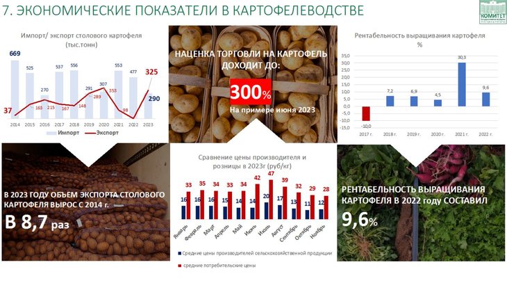 «Теперь давайте посмотрим на экономику в картофелеводстве. Обратите внимание на динамику цены в 2023 году, которая предлагается производителям картофеля и цену, которую устанавливает торговля на прилавке. Приведу пример из визита в Ульяновскую область. На базе фермерского хозяйства, после выкапывания и упаковки, картофель попадает в логистический центр, а потом на полке магазина цена на него вырастает с 14 до 40 рублей. Сейчас картофель закупают у производителя по 12 рублей, а в магазине ниже 30 рублей не найдете. Еще раз хочу сказать, всем кто занимается контролем, начиная от ФАС, правительства, экономического блока, нужно понимать, что 90% торговых сетей принадлежат иностранцам. Нужно стремится, чтобы доход распределялся справедливо», - подчеркнул Владимир Кашин.