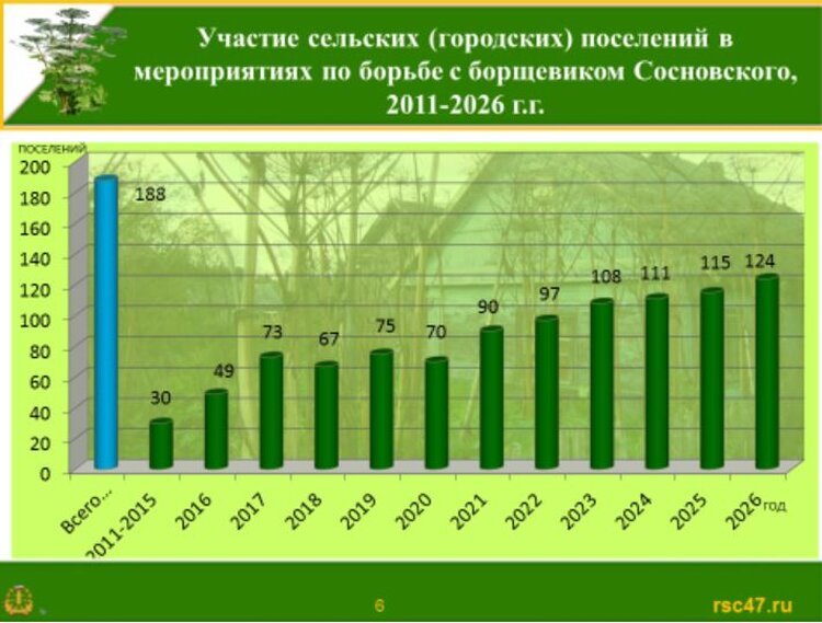 Число муниципалитетов-участников программы растет ежегодно. В этом году впервые присоединятся ещё девять городских и сельских поселений. Общая площадь их территорий, подлежащая обработке от инвазивного ядовитого растений, составит 107,03 га.