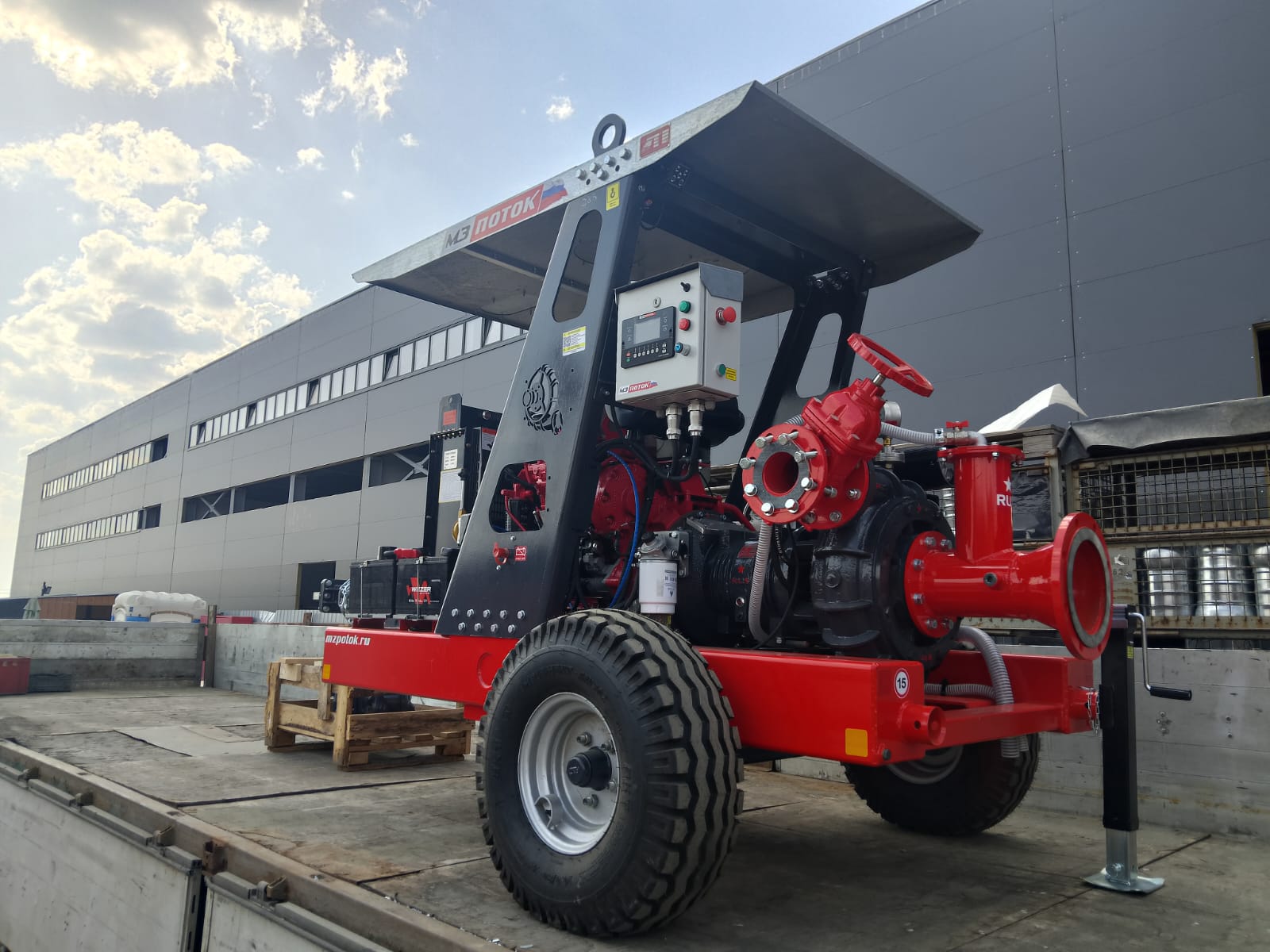 Дизельная насосная установка для пoлива и орoшения: на раме-баке с погодозащитным антивандальным капотом или козырьком на шасси с ходовыми огнями.