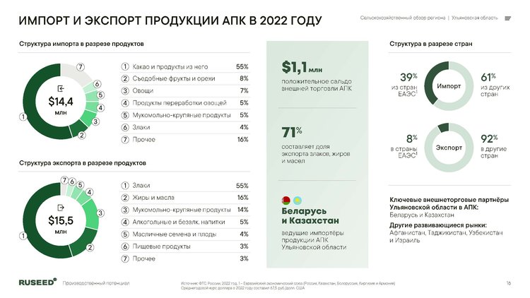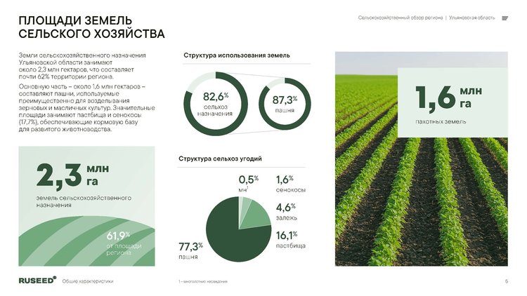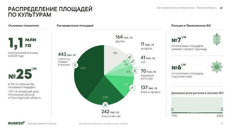 Итоги 2024 года показывают, что объем сельхозпроизводства достиг 75,2 млрд рублей, что свидетельствует о устойчивом развитии отрасли. Доля региона в общем объёме сельхозпродукции составила 0,8% в структуре РФ и 3,6% в Приволжском федеральном округе. На 2025 год суммарная посевная площадь превысила 1,1 млн гектаров.