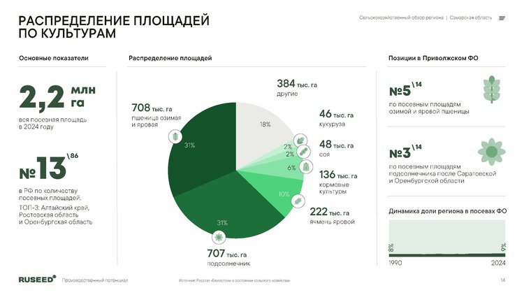 Самарская область демонстрирует значимые результаты на всероссийском уровне: её доля в общероссийском сельхозпроизводстве составляет 1,9%, а в Приволжском федеральном округе — 8,2%. В рамках ПФО регион удерживает 3-е место по площади посевов подсолнечника и 5-е — по площади посевов пшеницы. Кроме того, область занимает 12-е место в РФ по масличным культурам (3-е в ПФО) и 18-е по зерновым культурам (6-е в ПФО).