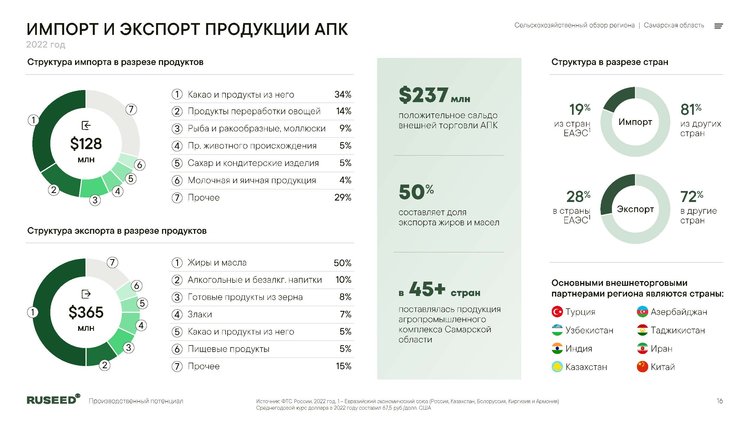 Обширная география экспорта подчеркивает высокий спрос на продукцию АПК Самарской области на мировых рынках. Примерно половина общего экспорта приходится на жиры и масла. Ведущие внешнеторговые партнёры — Турция, Узбекистан, Индия, Казахстан, Азербайджан, Таджикистан, Иран и Китай.