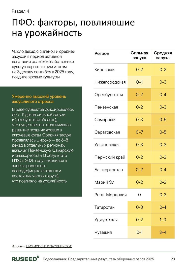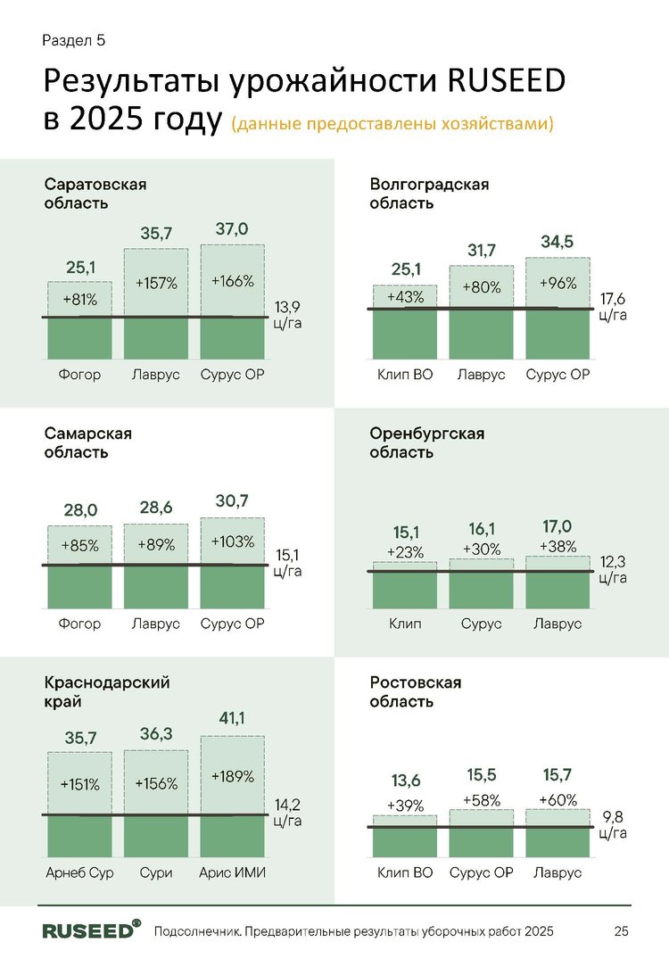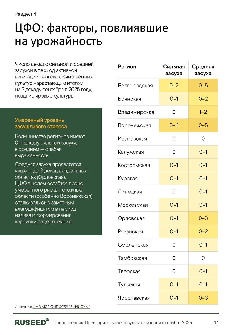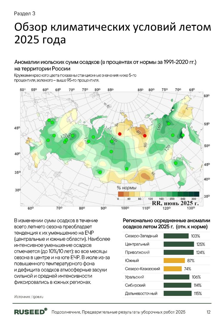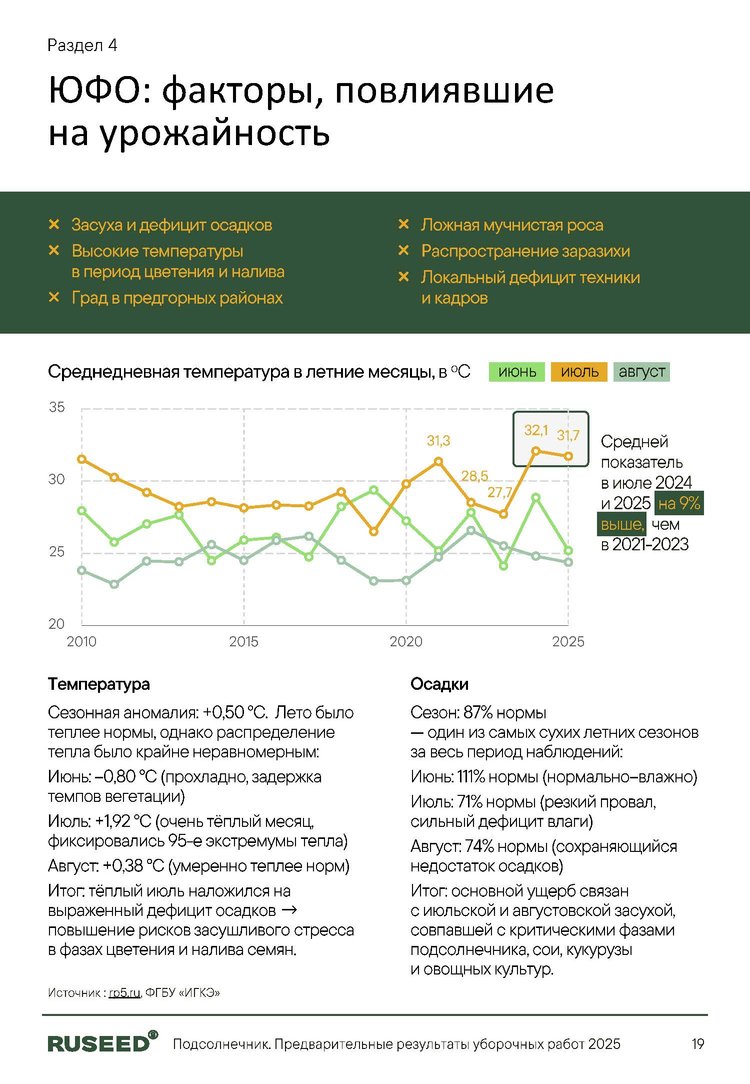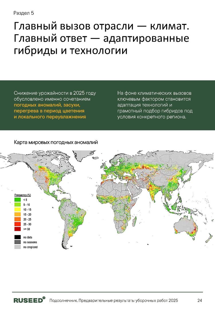 В 2025 году наблюдается снижение урожайности, являющееся проявлением глобального тренда, вызванного климатическими аномалиями сезона. По мере нарастания засушливых периодов возрастает приоритет выбора посевного материала. В таких условиях сельхозпроизводителям рекомендуется отдавать предпочтение высококачественным засухоустойчивым гибридам, обеспечивающим стабильный сбор даже при дефиците влаги.