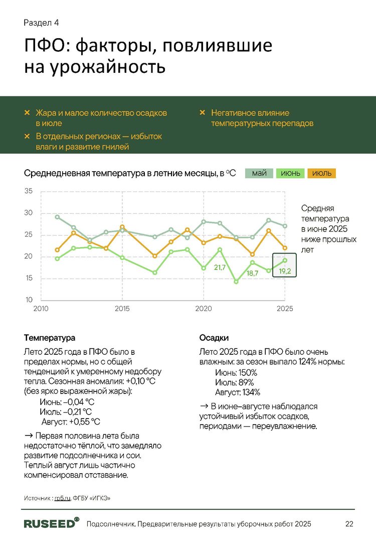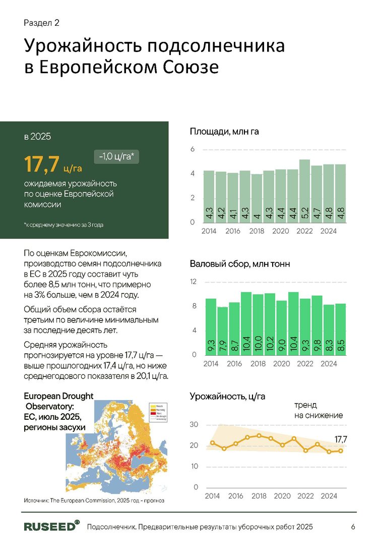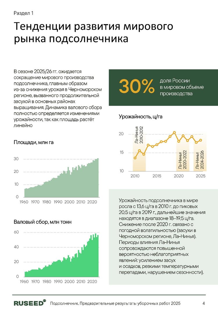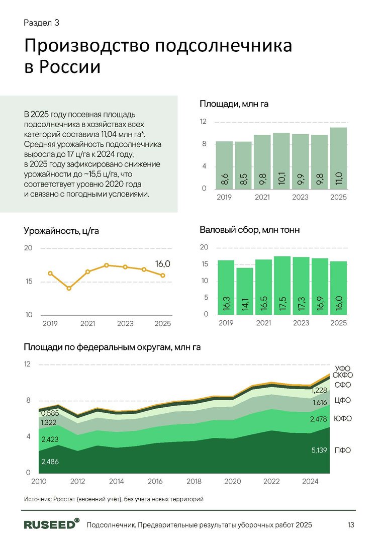 Россия, демонстрируя устойчивый рост посевных площадей и их перераспределение в более стабильные регионы — Приволжский и Сибирский федеральные округа, тем не менее столкнулась с климатическими и экономическими трудностями в аграрном секторе. В 2025 году посевная площадь подсолнечника во всех категориях хозяйств достигла 11,04 млн га. Средняя урожайность подсолнечника составила примерно 16 ц/га. Причина — погодные аномалии в ключевых зонах возделывания. Наибольшее влияние неблагоприятных метеоусловий ощутили южные регионы страны, в частности Ростовская область и Краснодарский край.
