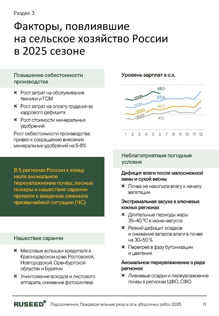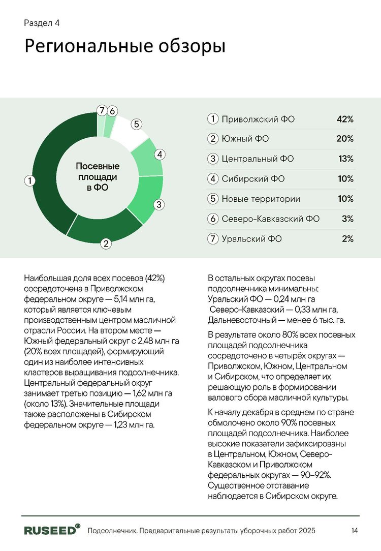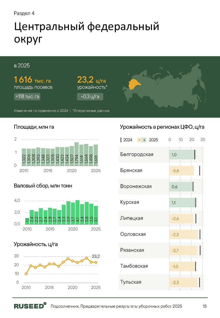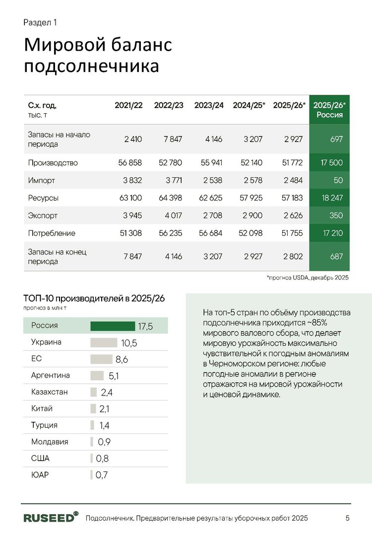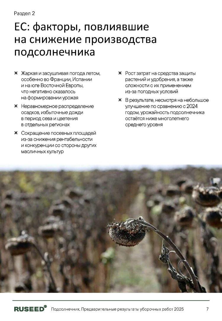 Россия, демонстрируя устойчивый рост посевных площадей и их перераспределение в более стабильные регионы — Приволжский и Сибирский федеральные округа, тем не менее столкнулась с климатическими и экономическими трудностями в аграрном секторе. В 2025 году посевная площадь подсолнечника во всех категориях хозяйств достигла 11,04 млн га. Средняя урожайность подсолнечника составила примерно 16 ц/га. Причина — погодные аномалии в ключевых зонах возделывания. Наибольшее влияние неблагоприятных метеоусловий ощутили южные регионы страны, в частности Ростовская область и Краснодарский край.
