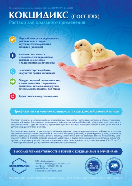 Кокцидикс – предназначен для лечения и профилактики кокцидиоза у сельскохозяйственных птиц. Представлен в виде раствора для орального применения. В 1 мл в качестве действующего вещества содержит толтразурил 25 мг.