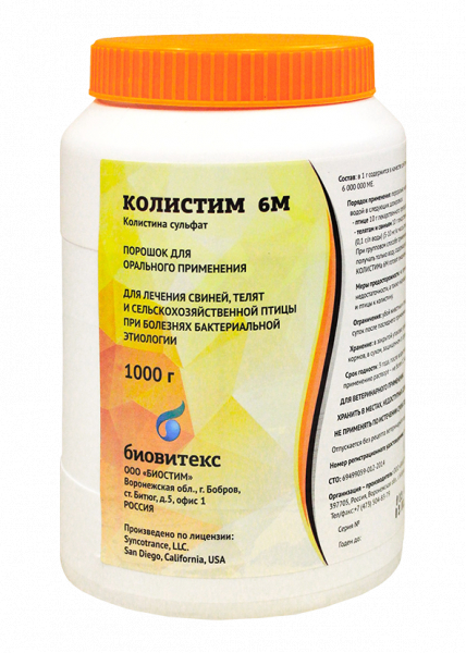 Для лечения свиней, телят и сельскохозяйственной птицы при болезнях бактериальной этиологии. Колистина сульфат, входящий в состав лекарственного препарата, активен в отношении многих патогенных микроорганизмов, включая E. Coli, Pseudomonasaeruginosa, Haemophilusspp., Proteusspp., Salmonellaspp. и Pasteurellaspp.