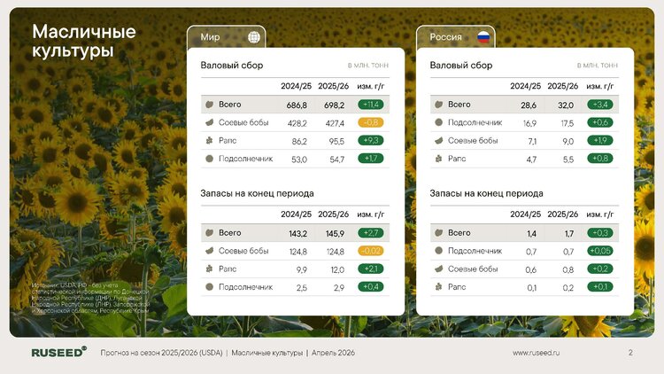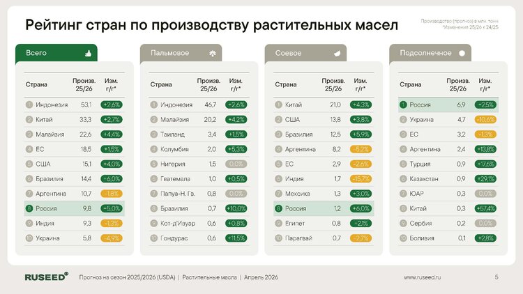 Рынок растительных масел: производство в 2025/26 ожидается на уровне 236,5 млн т (+6,3 млн т г/г, +0,6 млн т к марту). Россия укрепляет позиции: лидерство по подсолнечнику, рост по рапсу, экспорт масел до 6,5 млн т.