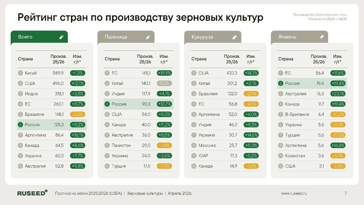 — Рапс: 95,5 млн т (без изменений к марту, +9,3 млн т г/г). Наибольший рост — в ЕС, Канаде, Австралии и России.