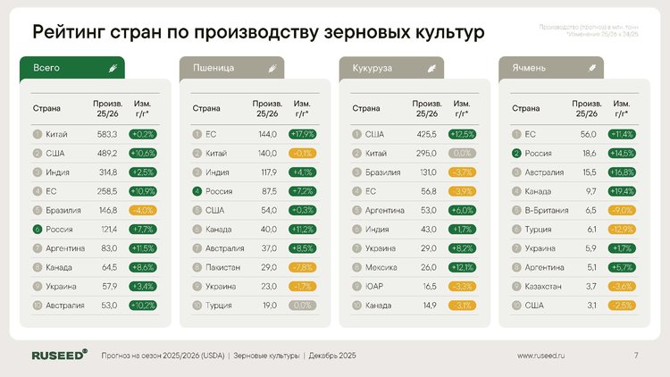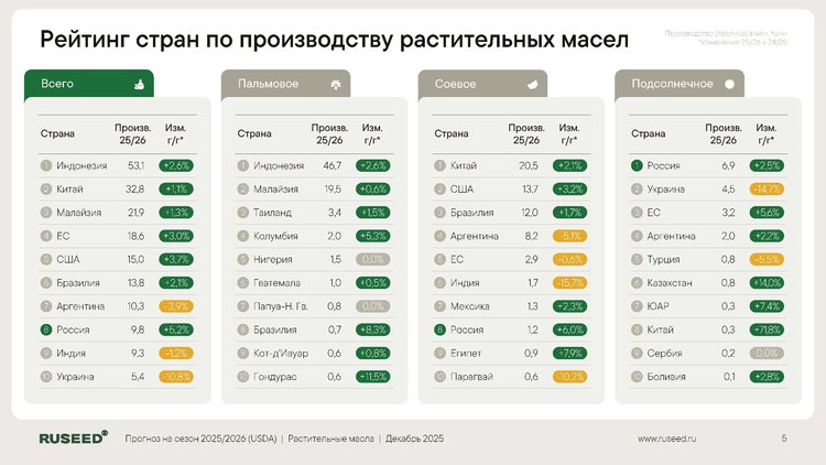 Глобальное производство снизилось до 51,8 млн т (−0,4 млн т к прошлому году) из‑за снижения урожайности в регионе Черного моря. Культура оказалась в фазе структурного дефицита, что поддерживает ценовую премию для производителей, но создаёт сложности для переработчиков. Россия демонстрирует рост выпуска на 0,6 млн т (+3,5%), тогда как на Украине ожидается существенное снижение на 2,5 млн т.
