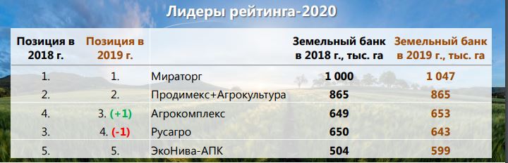 В 2020 году из рейтинга выбыли две компании, земельные банки которых на текущий момент составляют существенно меньше 100 тыс. га - «Агрико» и «Русская Аграрная Группа», но при этом появились семь новых участников из самых разных регионов страны – от Ставрополя до Калининграда.