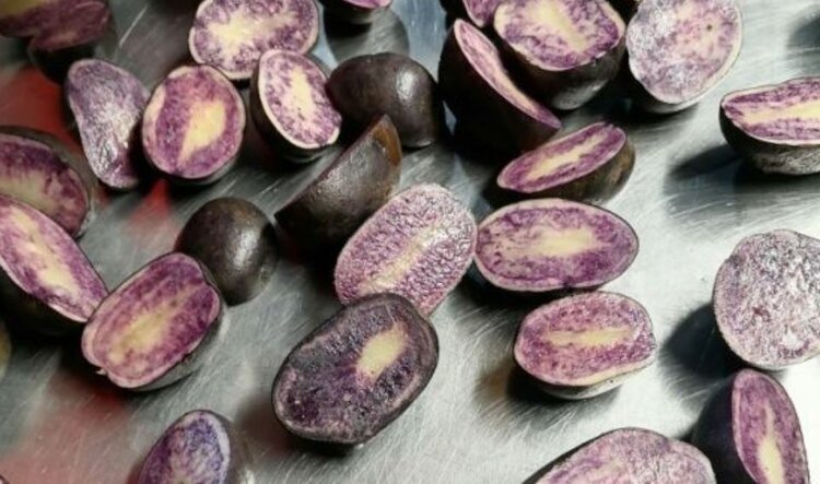 Картофель сорта Индиго имеет оригинальный фиолетовый цвет кожуры и мякоти, относится к среднеранним столовым сортам и обладает потенциалом урожайности до 60 т/га. Средний вес одного клубня составляет от 98 до 167 г.