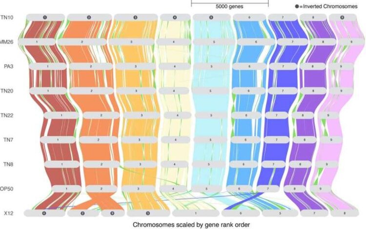 На заглавном графике вы видите синтеническую карту ортологичных регионов в девяти геномах SCN. Хромосомы упорядочены и раскрашены таким образом, чтобы максимизировать карту с референсным геномом (TN10). Инвертированные хромосомы обозначены черным кругом. Крупные структурные инверсии выделены зеленым цветом. Источник: BMC Genomics (2026). DOI: 10.1186/s12864-025-12493-x
