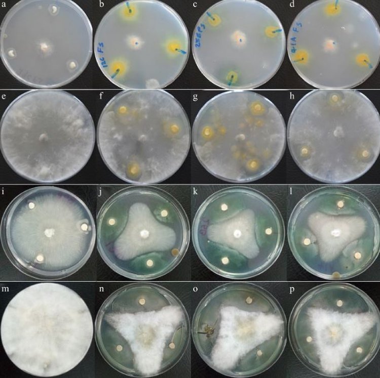 TZSR12C был способен образовывать чистые зоны у трех грибов, F. solani, M. phaseolina и R. solani, в то время как Rhizobium sp. TZSR25B и Bardyrhizobium sp. TZSR41A были способны образовывать зоны ингибирования только у двух грибов, которыми являются F. solani и M. phaseolina. С другой стороны, самая большая колония 25,0 мм против F. oxyporum и сразу за ней 25 мм против R. solani, в то время как самая маленькая колония 4,7 мм против M. phaseolina были образованы Rhizobum sp. TZSR25B.