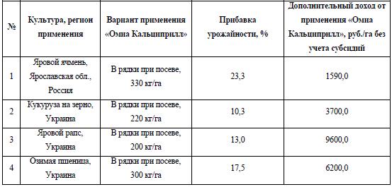 Экономическая эффективность применения подтверждена более, чем в 30 странах, включая Россию и Украину (повышение урожайности, снижение полегаемости зерновых, увеличение содержания протеина в сое, масла в рапсе, улучшение облиственности и поедаемости кормов). Аналогов в России нет. Основные показатели экономической эффективности показаны в таблице 2.