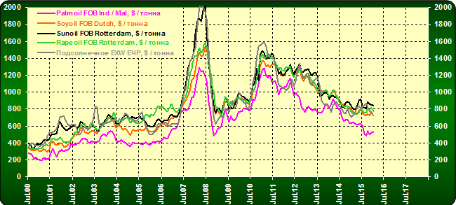 Динамика мировых и внутренних цен зерновых и масличных с июля 2000 по январь 2016 года *