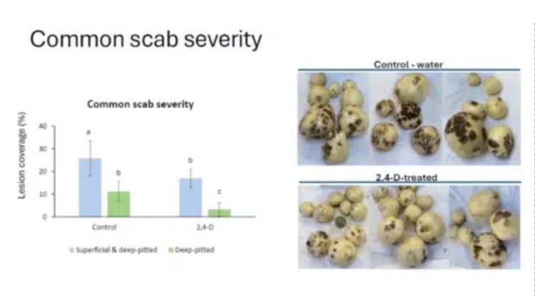 Полевые исследования сорта Руссет Норкота (Russet Norkotah) в 2021 году показали снижение поражения паршой обыкновенной при применении 2,4-D в низких дозах, а также увеличение количества клубней, соответствующих ключевому критерию товарности. Команда Гойер оценивала клубни по проценту поражения поверхности, а затем отслеживала долю клубней с поражением паршой менее пяти процентов.
