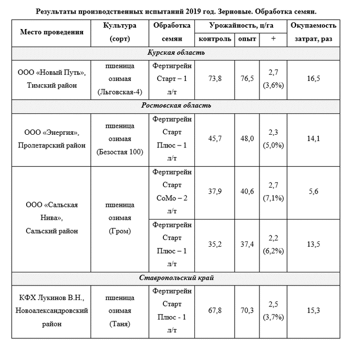 Применение при протравливании Фертигрейн Старт Плюс (в норме 0,5-2 л/тонну) позволяет получить дополнительный урожай зерна, который многократно окупает довольно незначительные затраты. Экономическая оправданность данного агроприема подтверждена многолетними научными и производственными испытаниями в различных природно-климатических и погодных условиях; в среднем прибавка урожайности зерновых составляет 2-5 ц/га. В таблице 2 приведены данные производственных испытаний эффективности обработки семян зерновых удобрением Фертигрейн Старт Плюс только за предыдущий сезон.