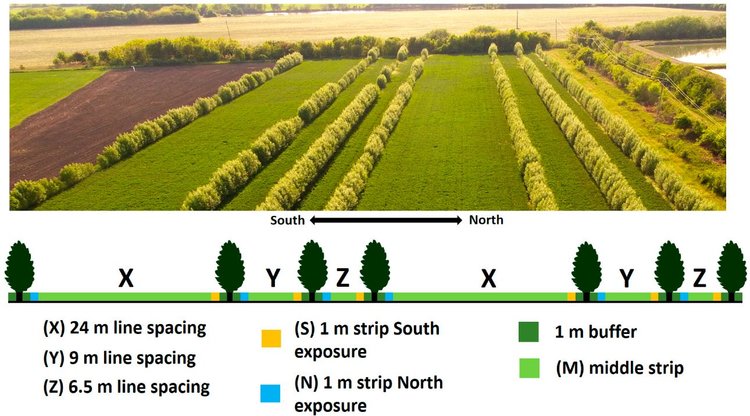 Сегодня между рядами ивовых деревьев находятся 3 поля разной ширины (X: 24 м, Y: 9 м, Z: 6,5 м) в двух повторностях для совмещения культур. Ориентация рядов деревьев — с востока на запад, что является рекомендуемой ориентацией для уменьшения затенения пахотных земель деревьями.