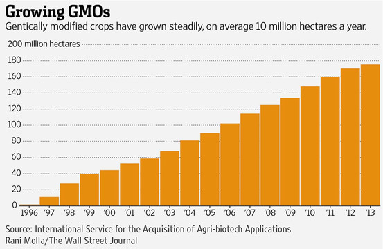 Когда генетически модифицированные сельскохозяйственные культуры начали использовать в коммерческих целях, а произошло это в 1996 году, фермеры их возделывали на 1,7 млн га (4,2 миллиона акров). Сегодня, согласно данным International Service for the Acquisition of Agri-biotech Applications — некоммерческой организации, которая продвигает биотехнологические методы в сельское хозяйство и частично финансируется биотехнологическими компаниями, осуществляя мониторинг рынка трансгенных семян, под ГМ-культурами занято 175 млн га.
