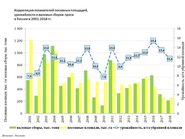 В последние три года просо занимало унылую позицию аутсайдера на российском рынке зерновых культур. По итогам прошлого сельхозсезона валовой сбор культуры снизился до минимального за последние восемь лет показателя — 296 тысяч тонн. В хозяйствах сокращали посевные площади под просо, в том числе в основных регионах выращивания этой культуры – Саратовской и Ростовской областях. Кроме того, в Поволжье и южных регионах России посевы просо пострадали от жары и засухи, в результате чего урожайность оказалась ниже ожидаемой.