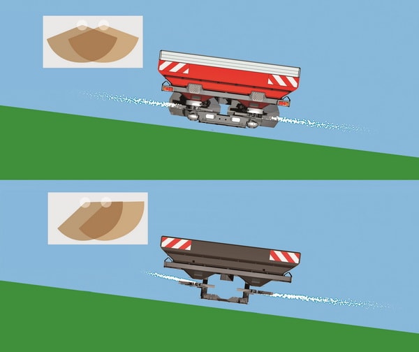 - CentreFlow – система разбрасывания с 8 лопатками на каждом диске помогает достигать идеального перекрывания, независимо от присутствия ветра, наличия склонов и скорости.