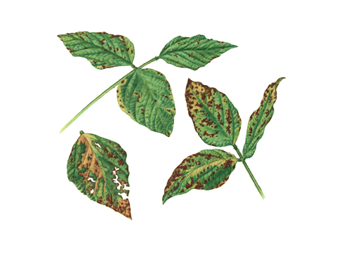 Симптомы болезни проявляются на всех надземных органах сои в течение всего вегетационного периода. Внутренняя сторона котиледонов покрывается бурыми пятнами и некротическими язвами. Они разрастаются и охватывают верхушечные части растений. При этом образуются повреждения типа «змеиная головка».
