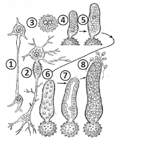 Позднее зигота прорастает и в образовавшийся вырост переходят два гаплоидных ядра. Здесь они сливаются и образуют диплоидное ядро, которое многократно делится. Первый раз редукционно. Формируется большое число гаплоидных ядер, вокруг которых образуются зооспоры.