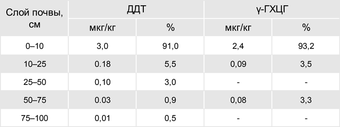 Из-за высокой сорбционной способности почвы рассеяние и миграция любых загрязняющих примесей происходит намного медленнее, чем это наблюдается в гидросфере и атмосфере. На сорбционные характеристики земли сильно влияет содержание в ней органических веществ и влаги. Легкие песчаные почвы (песок, супесь) хуже удерживают хлорорганические экотоксиканты, которые поэтому могут легко перемещаться вниз по профилю, загрязняя подземные и грунтовые воды. Эти компоненты в богатых гумусом почвах достаточно долгое время остаются в верхних горизонтах, главным образом, в слое до 20 см. Как видно из табл. (фото) через 5 месяцев после внесения в почву богатую органическим веществом более 90% ГХЦГ и ДДТ находилось в десятисантиметровом слое. В то же время, после почти 20-летнего использования ДДТ вещество почти равномерно распределилось в слое глубиной до 100 см.[5]