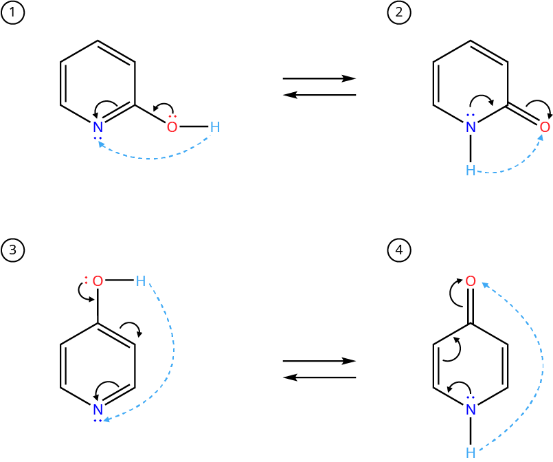 α- и γ-гидроксипиридины – таутомерные соединения. Они существуют в двух таутомерных формах: гидроксиформе и оксоформе. В водном растворе эти соединения находятся преимущественно в оксо-, или так называемой пиридоновой, форме, в неполярных растворителях и в газовой фазе преобладает гидроксиформа. (фото «Таутомерность гидроксипиридинов»)[5].