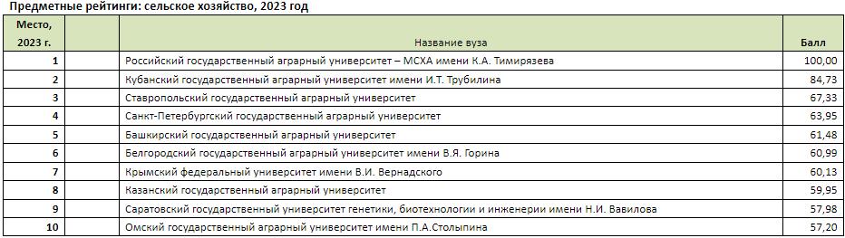 Это второй выпуск предметных рейтингов, но рейтинг по сельскому хозяйству включен в перечень направлений впервые. Лидером в области сельского хозяйства стал Российский государственный аграрный университет – МСХА имени К. А. Тимирязева.