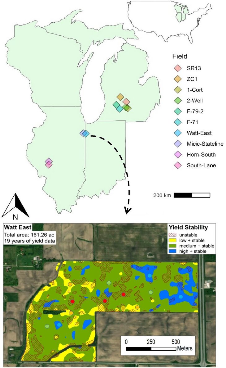 Расположение полевых участков в Мичигане, Иллинойсе и Индиане, с примером поля, показывающим три места отбора проб почвы (цветные кружки), случайно выбранные в пределах каждого из четырех уровней зон стабильности урожайности (YSZ); нестабильный (US), низкий и стабильный (LS), средний и стабильный (MS) и высокий и стабильный (HS), определяемый в каждом поле. Карта создана Рубеном Ульбрихом с использованием программного обеспечения ArcGis 10.8.2. (www.esri.com).