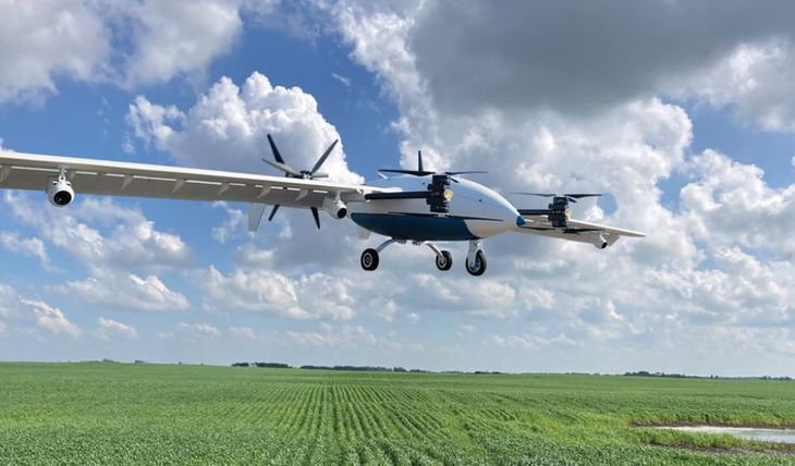 Этот БПЛА не квадрокоптер, как многие сельскохозяйственные дроны. Солидный самолет имеет два метра в длину с размахом крыла семь метров, летит со скоростью более 70 километров в час, проносясь над полями на высоте двух метров над землей. Беспилотник оснащен гибридным бензино-электрическим двигателем, который обеспечивает до двух часов полета. Два набора вращающихся пропеллеров позволяют ему взлетать и приземляться вертикально, поэтому взлетно-посадочная полоса не требуется.