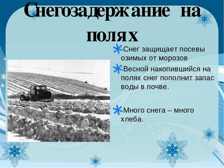 - Устраивалось снегозадержание из заборов деревянных, камышовых и прочих подручных материалов, из кулисных посевов высокорослых растений.