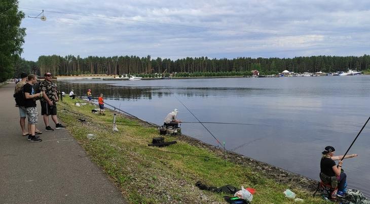 В честь Дня рыбака на празднике прошла рыболовная олимпиада сразу в трех дисциплинах. Спортсмены-рыбаки ловили на поплавочную удочку, на втором участке - на донную удочку и на третьем - спиннингом с берега.