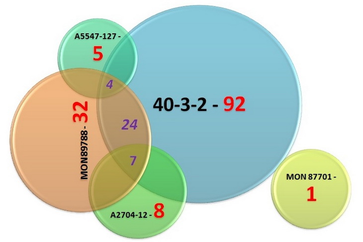 Пояснение к схеме: Внутри кругов красными цифрами указано количество кормовых продуктов, содержащих линию (в том числе и сама соя данной линии). На стыке кругов фиолетовыми цифрами указано количество кормовых добавок, содержащих сою обеих или сразу трех линий. Такие продукты уже учтены в цифрах внутри кругов.
