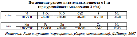Рапс особенно требователен к наличию в необходимом количестве и в нужные фазы развития таких микроэлементов как бор, марганец и молибден. Бор играет важную роль в биологии оплодотворения (рост пыльцевых трубок, прорастание пыльцы, увеличение количества цветков и плодов). Бор способствует приросту корней, повышает эластичность тканей (уменьшается растрескивание стеблей и корневой шейки при морозе), повышает устойчивость к болезням, регулирует углеводный и белковый обмен. При недостатке бора замедляется рост растений, молодые листья имеют более светлую окраску, на более старых листьях наблюдаются красноватые (или даже фиолетовые) пятна. Озимый рапс поглощает 25% бора осенью, его недостаток отрицательно сказывается на перезимовке.