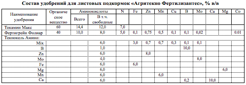 Удобрения Фертигрейн Фолиар и Текнокель Амино (8 марок) разработаны специально для применения в качестве листовых корректоров питания растений в зависимости от дефицита того или иного мезо- или микроэлемента (по результатам листовой диагностики или для превентивного устранения возможного микродефицита в зависимости от потребности растения). Их состав приведен в таблице 3.