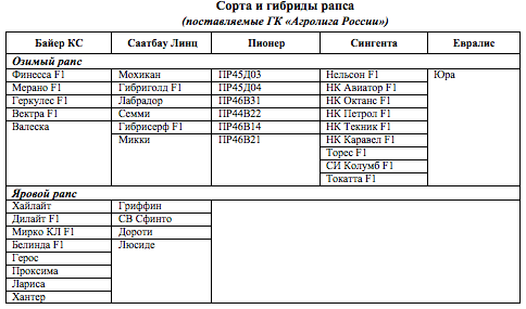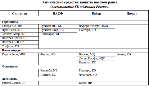 Группа компаний «Агролига России» предлагает растениеводам не только биостимуляторы-удобрения, но и полный технологический пакет, необходимый для выращивания рапса и других сельскохозяйственных культур: семена (таблица 4) и средства защиты растений ведущих зарубежных химических компаний (таблица 5).