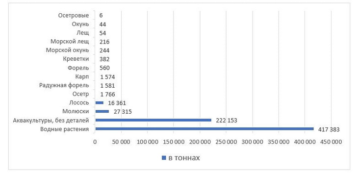 Наибольшее количество аквакультуры - 60 процентов - приходится на водоросли. На втором месте - моллюски. Затем идут лосось, осетр, форель.