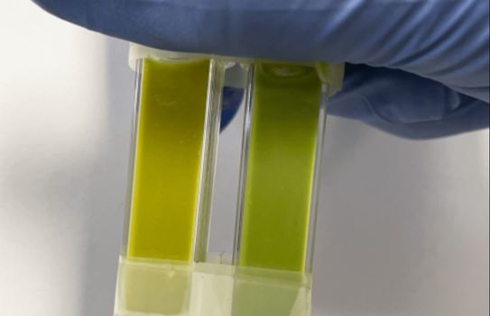 Индикаторный краситель смешивается с молоком. Этот раствор помещается в двухкамерный флакон, один из которых содержит фермент уреазу. Приложение делает снимок флаконов, вычисляет разницу в цвете и предоставляет значение MUN.