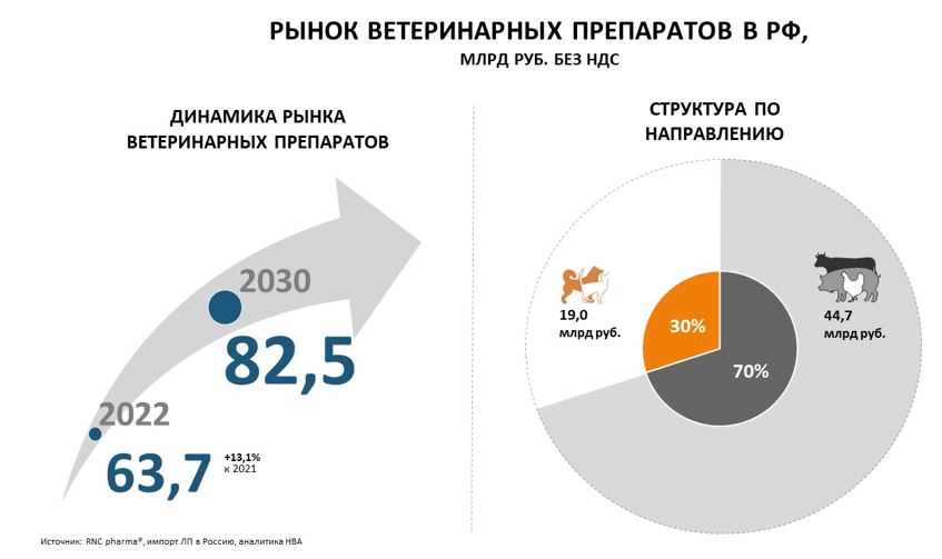 По сравнению со стабильной цифрой 54-56 млрд руб. за период 2019-2021 гг. это стремительный рост рынка. По прогнозам ассоциации, к 2030 году объем производства ветпрепаратов в РФ вырастет до 82,5 млрд рублей.