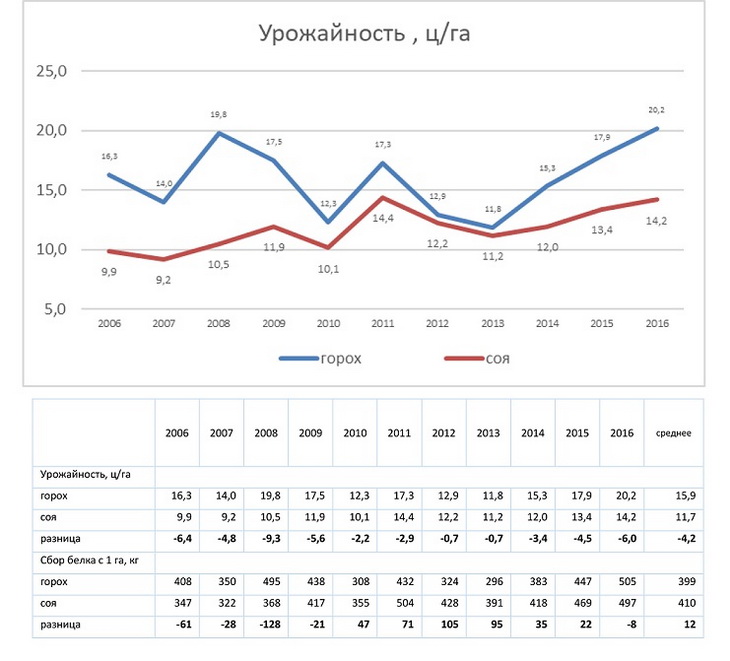 На графике и в таблице представлены урожайность (данные РосКомСтата) и сбор белка (расчетные: для сои – 35%, для гороха – 25%). Получается, что объективная разница составляет в среднем всего 12 кг/га белка или менее 3% в пользу сои, а в некоторые годы сбор белка сои даже ниже чем у гороха.