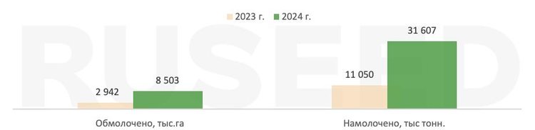 Площадь уборки рапса составила 214 тыс. га, что на 110 тыс. га больше, чем в 2023 году (104 тыс. га). На 10 июля было намолотлено 404 тыс. тонн рапса, в то время как в прошлом году на эту же дату было получено 263 тыс. тонн.