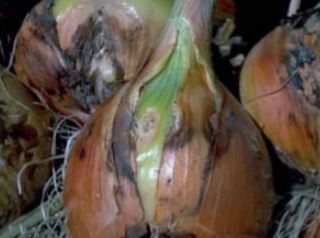 Развитие ее начинается еще на огородной грядке. Во второй половине лета, когда листья лука подвядают и полегают, гриб проникает в шейку луковицы. Ткани ее размягчаются, образуется вмятина. Через 1—2 месяца после уборки гниль охватывает всю луковицу, она становится водянистой, приобретает желто-розовый оттенок, издает неприятный запах.