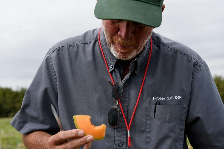 Заводчик дынь Билл Копс вместе со своей командой проводят опыты в демонстрационном саду семеноводческого производителя HM Claus в Дэвисе. Copes является частью команды, работающей над трехлетним исследованием в UC Davis, спонсором которого является HM Clause, чтобы идентифицировать и сочную текстуру этой тыквенной культуры в надежде закрепить эти черты. «Клиенты нуждаются в аромате,» - говорит он.