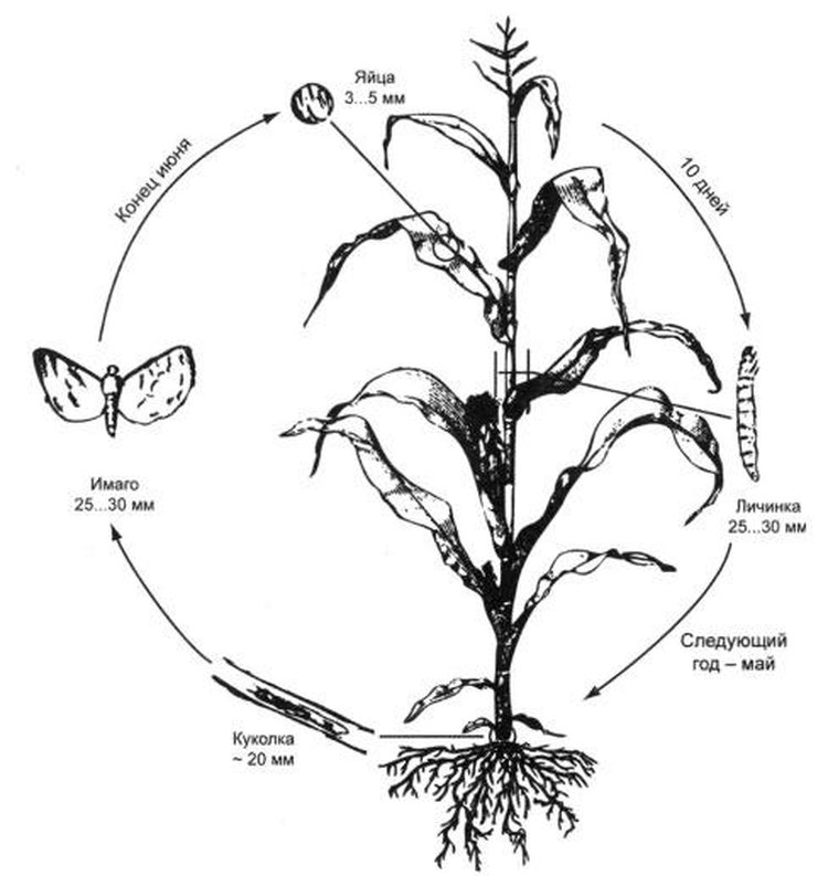 Кукурузный или стеблевой мотылек относится к чешуекрылым вредителям семейства огнёвки. Он поражает не только кукурузу, но и около 250 других видов растений, включая овощные, бобовые и злаковые культуры. Днем мотыльки прячутся на обратной стороне листьев и в нижних горизонтальных слоях растений. А ночью и в сумерки, когда влажность повышается и спадает жара, их активность возрастает.