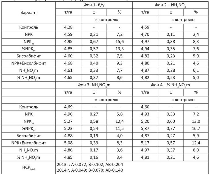 На фонах с модифицированной аммиачной селитрой, как в половинной, так и в полной дозе, из-за повышения активности микроорганизмов было еще большее увеличение урожайности по сравнению с фонами Б/у и NH4NO3. Наибольшая урожайность была получена на фоне / NH4NO3m на варианте /NPKm - 5,37 т/га и на фоне NH4NO3m на варианте NPKm - 5,27 т/га. В целом, наиболее высокая урожайность сформировалась на вариантах с внесением биоминеральных удобрений.